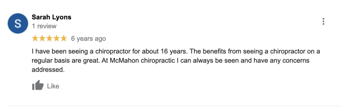 Disclaimer: Procedures and treatments performed by McMahon Chiropractic have an inherent success (and failure) rate. Reviews, testimonials and content on this site should not be interpreted as a statement of efficacy of procedures and treatments performed by McMahon Chiropractic for anyone else.